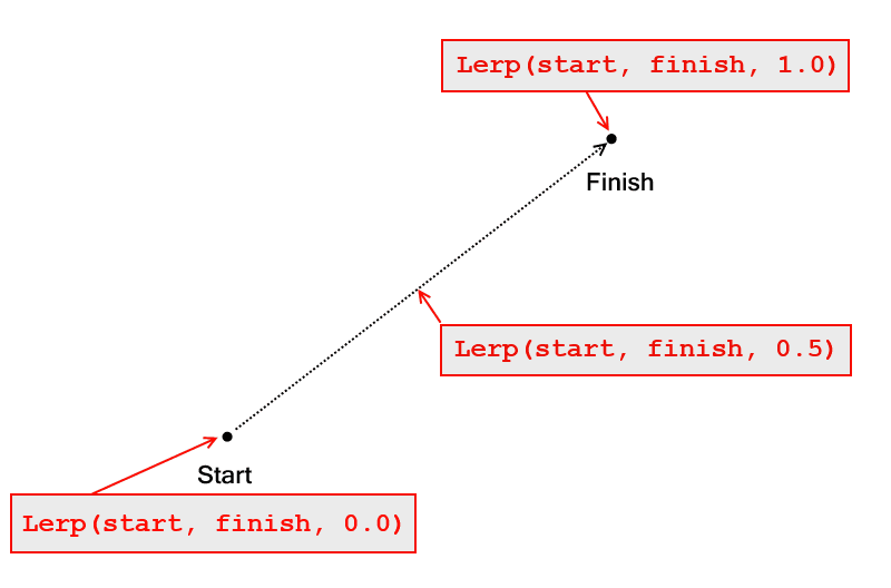 위 그림에 나온 것처럼 Lerp() 함수안에 시작벡터와 목표벡터를 넣고, 마지막 인자에는 0.0~1.0 사이의 값을 넣는데 이 값이 0.0 = 0%, 1.0 = 100% 라고 생각하시면됩니다. 위 그림처럼 0.5를 넣으면 50%니 시작벡터와 목표벡터의 중간에 있는 벡터값이 나오게 되고, 0.0은 0%니 시작벡터가 1.0은 100%니 목표벡터가 나오게 됩니다. 이를 이용해서 한 템포 늦게 플레이어를 따라가는 카메라를 구현한 예제입니다.